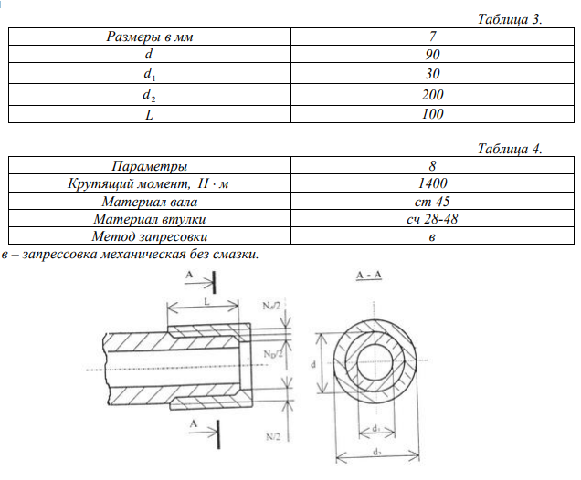 1. По данным в табл. 3 и 4 рассчитать и выбрать из ГОСТ 25347-82 подходящую посадку с натягом для гладкого цилиндрического соединения, изображенного на рис.2. 2. Построить схему расположения полей допусков выбранной посадки с указанием натягов.