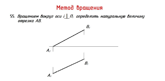 Задача 55: Вращением вокруг оси i перпендикулярной П1 определить натуральную величину отрезка АВ