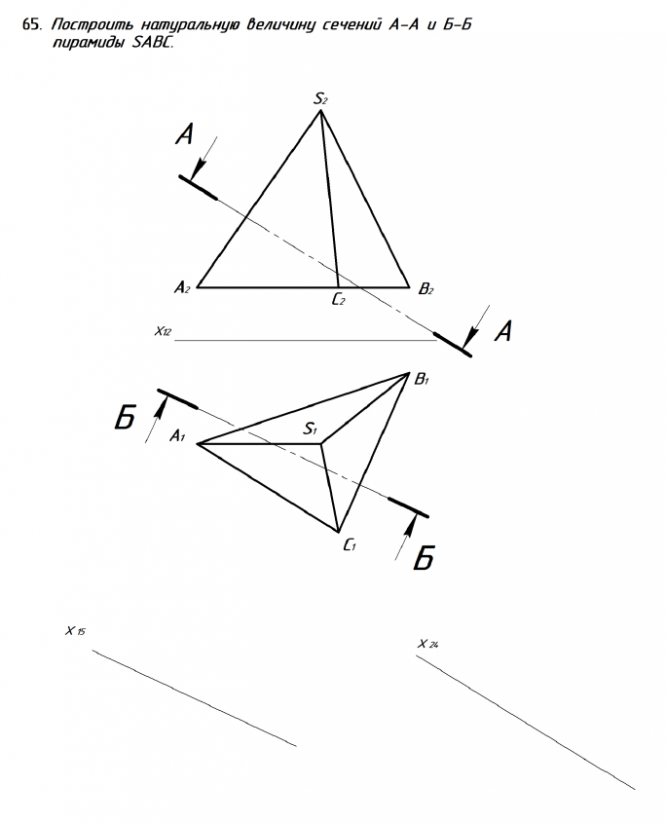 Задача 65: Построить натуральную величину сечений А-А и Б-Б пирамиды SABC