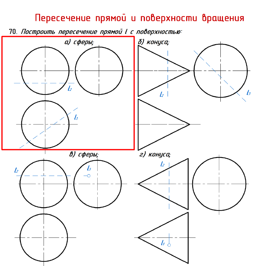 Задача 70: Построить пересечение прямой L с поверхностью сферы