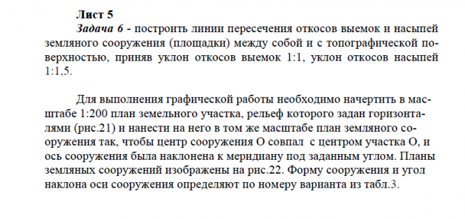 Показать/скрыть дополнительное описаниеЛист 5 Задача 6 - построить линии пересечения откосов выемок и насыпей земляного сооружения (площадки) между собой и с топографической поверхностью, приняв уклон откосов выемок 1:1, уклон откосов насыпей 1:1,5. Для выполнения графической работы необходимо начертить в масштабе 1:200 план земельного участка, рельеф которого задан горизонталями (рис.21) и нанести на него в том же масштабе план земляного сооружения так, чтобы центр сооружения О совпал с центром участка О, и ось сооружения была наклонена к меридиану под заданным углом. Планы земляных сооружений изображены на рис.22. Форму сооружения и угол наклона оси сооружения определяют по номеру варианта из табл.3. Министерство образования и науки Российской Федерации Федеральное государственное бюджетное образовательное учреждение высшего профессионального образования «Тихоокеанский государственный университет» НАЧЕРТАТЕЛЬНАЯ ГЕОМЕТРИЯ Краткие сведения, методические указания и контрольные задания к изучению дисциплины для студентов направлений БСТР, БЛД, БНД, БТБ, БЗМК заочной формы обучения .