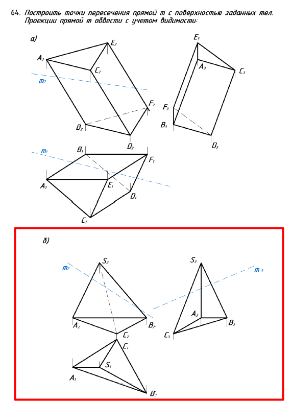 Задача 64: Построить точки пересечения прямой m с поверхностью заданных тел. Проекции прямой m обвести с учетом видимости