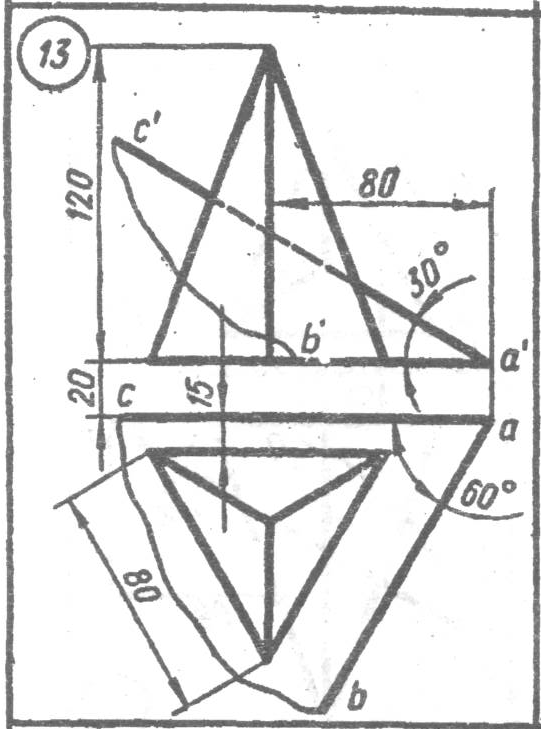 Нужно определить линию пересечения пирамиды с плоскостью общего положения abc и определить истинную величину . Для определения линии пересечения достаточно определить точки пересечения боковых рёбер пирамиды с секущей плоскостью. Для этого через одно из рёбер пирамиды проводим горизонтально-проецирующую плоскость. Эта плоскость пересечёт секущую по прямой. Построим фронтальную проекцию этой прямой и определим точку пересечения это проекции с фронтальной проекцией ребра пирамиды, через которое проводили горизонтально-проецирующую плоскость. В нашем случае получим точку 1”. Спроецировав полученную точку с помощью линии связи на горизонтальную проекцию соответствующего ребра получим горизонтальную проекцию точки 1’.