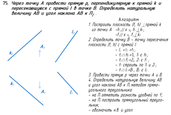 Главная » Учебные материалы » Начертательная геометрия » Решения задач » ИГЭУ им. Ленина » Несколько классов/семестров » Номер 75 » Через точку А провести прямую р, перпендикулярную к прямой k и пересекающуюся с прямой l в точке В. Определить натуральную Величину АВ и угол наклона АВ к П2.