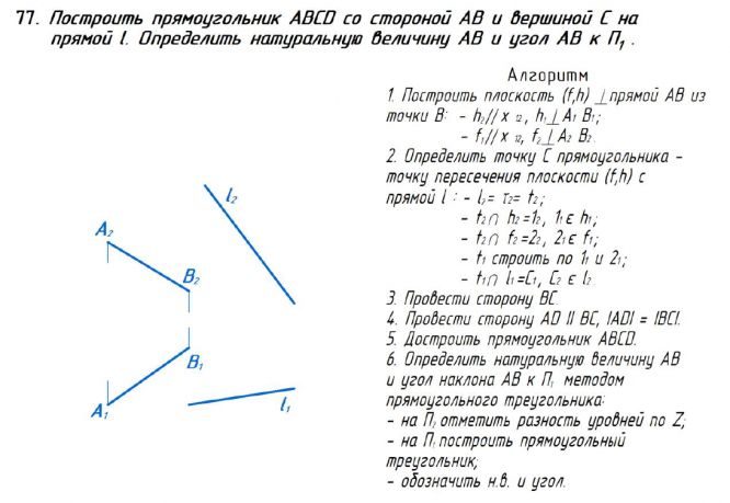 Для студентов ИГЭУ им. Ленина по предмету Начертательная геометрияПостроить прямоугольник ABCD со стороной АВ и вершиной С на прямой l. Определить натуральную величину АВ и угол АВ к П1.Построить прямоугольник ABCD со стороной АВ и вершиной С на прямой l. Определить натуральную величину АВ и угол АВ к П1.