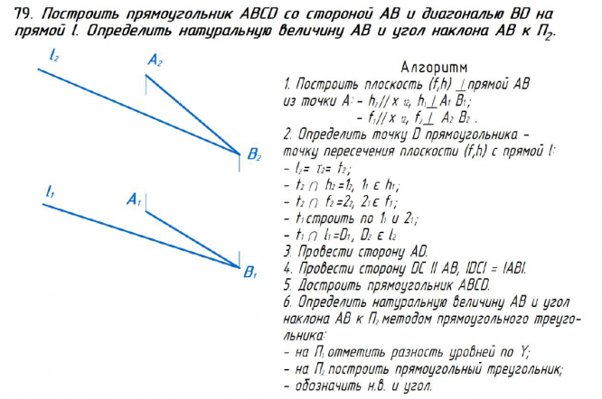 Главная » Учебные материалы » Начертательная геометрия » Решения задач » ИГЭУ им. Ленина » Несколько классов/семестров » Номер 79 » Построить прямоугольник ABCD со стороной АВ и диагональю BD на прямой l. Определить натуральную величину АВ и угол наклона АВ к П2.