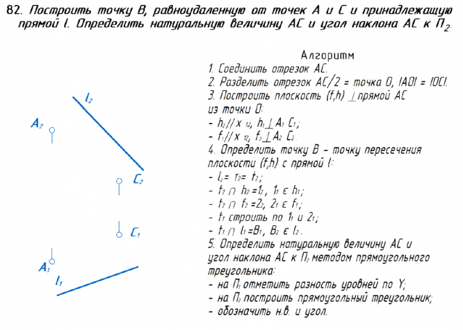 Для студентов ИГЭУ им. Ленина по предмету Начертательная геометрияПостроить точку В, равноудаленную от точек А и С и принадлежащую прямой l. Определить натуральную величину АС и угол наклона АС к П2.Построить точку В, равноудаленную от точек А и С и принадлежащую прямой l. Определить натуральную величину АС и угол наклона АС к П2.