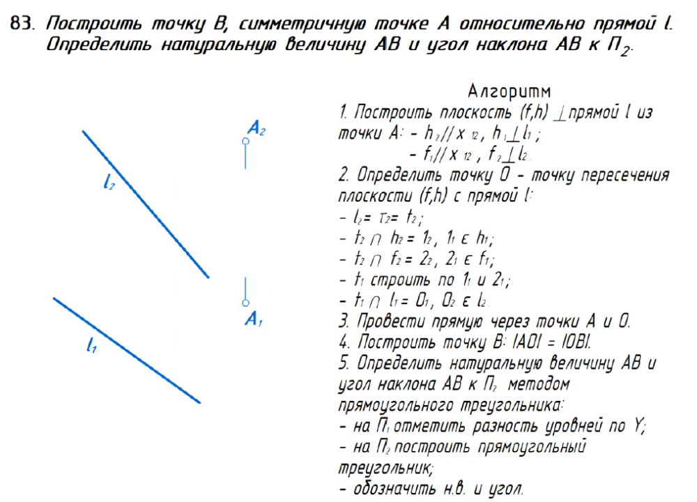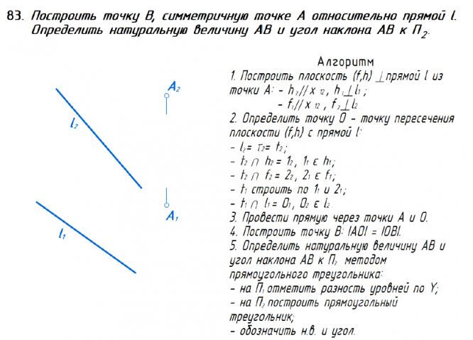 Для студентов ИГЭУ им. Ленина по предмету Начертательная геометрияПостроить точку В, симметричную точке А относительна прямой l. Определить натуральную величину АВ и угол наклона АВ к П2.Построить точку В, симметричную точке А относительна прямой l. Определить натуральную величину АВ и угол наклона АВ к П2.