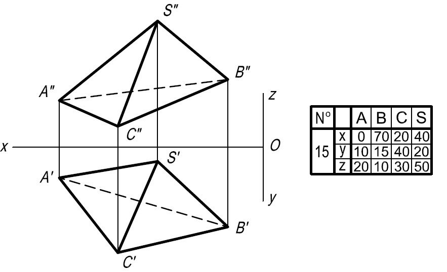 • Задача 3. Дана пирамида SABC. Определить, применяя способы преобразования чертежа: