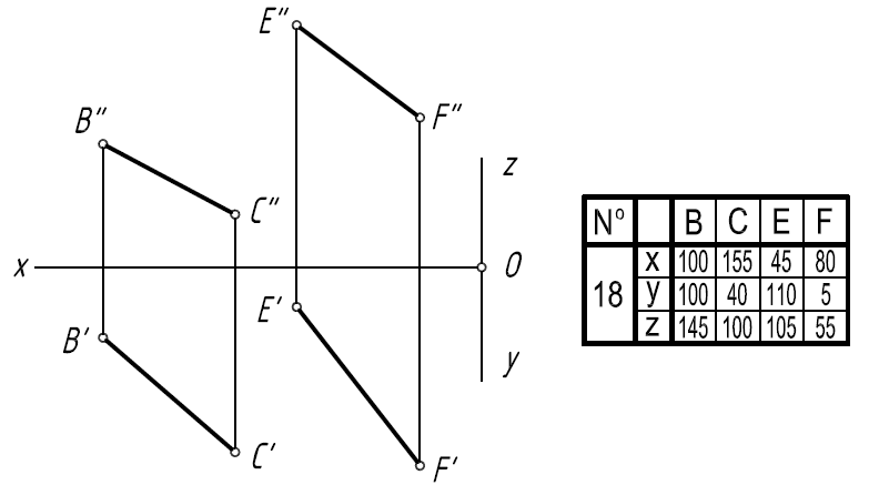 • Задача 2. Построить проекции пирамиды SABC при условии, что её высота равна 80 мм, а вершина S принадлежит прямой ЕР. Решить без преобразования чертежа.