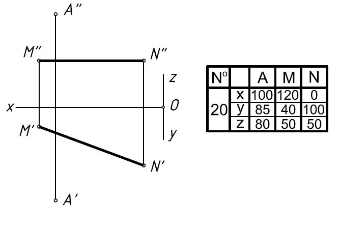 • Задача 1. Построить проекции равностороннего треугольника АВС со стороной ВС на прямой MN. Определить углы наклона высоты и плоскости треугольника к плоскостям проекций.