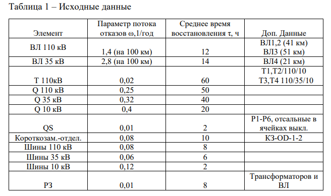 1. Определить показатели надежности системы электроснабжения при отсутствии резервирования.