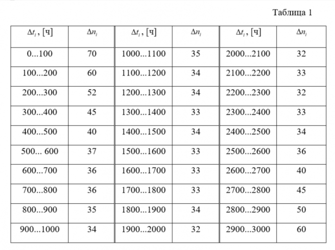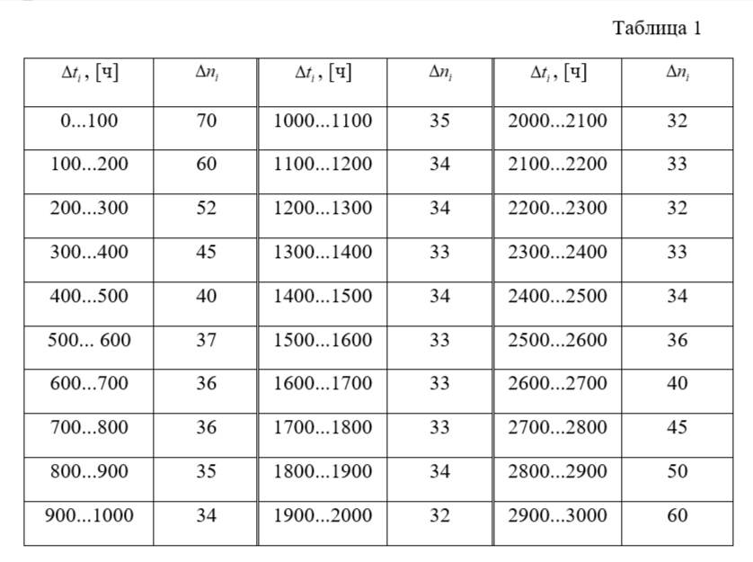 На испытании находились No=2200 образцов невосстанавливаемой аппаратуры. Число отказов Δni фиксировалось каждые часов. Продолжительность испытаний Ти = 3000 часов. Данные об отказах приведены в таблице 1, где N – номер варианта (20).