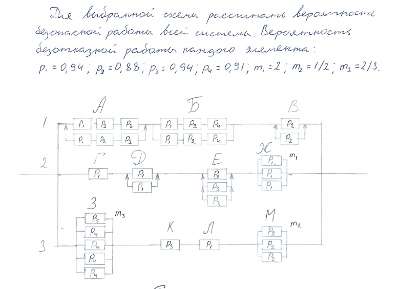 Для выбранной схемы рассчитать вероятность безопасной работы всей системы. Вероятность безотказной системы каждого элемента.