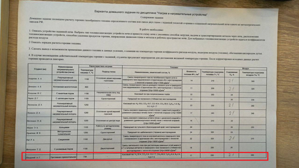 Домашнее задание посвящено расчету горения газообразного топлива определенного состава или смеси двух газов с заданной теплотой сгорания в пламенной нагревательной печи одного из металлургических заводов РФ. .