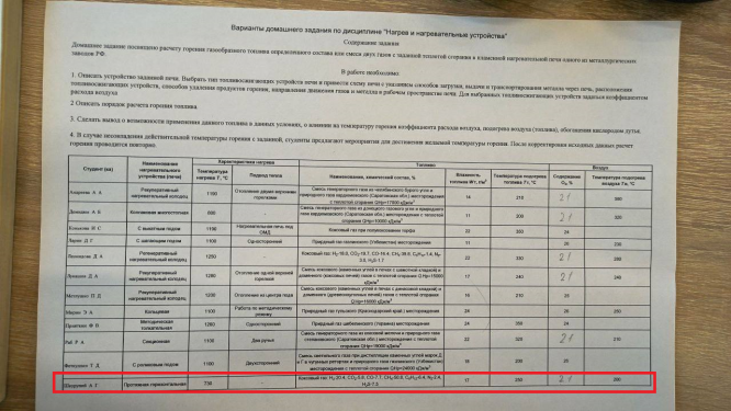 Домашнее задание посвящено расчету горения газообразного топлива определенного состава или смеси двух газов с заданной теплотой сгорания в пламенной нагревательной печи одного из металлургических заводов РФ. .