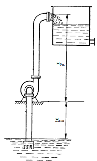 Насос забирает воду с t =10 0С из колодца глубиной 2,5 м и перекачивает её в открытый водонапорный бак, находящийся на высоте 40 м. Составить схему подачи воды и определить требуемое давление насоса р, если гидравлическое сопротивление трубопровода составляет ртс = 0,85·105 Па.