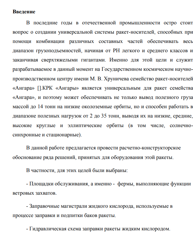 В данной работе предлагается провести расчетно-конструкторское обоснование ряда решений, принятых для оборудования этой ракеты. В частности, для этих целей были выбраны: - Площадки обслуживания, а именно - фермы, выполняющие функции ветровых захватов. - Заправочные магистрали жидкого кислорода, используемые в процессе заправки и подпитки баков ракеты. - Гидравлическая схема заправки ракеты жидким кислородом.