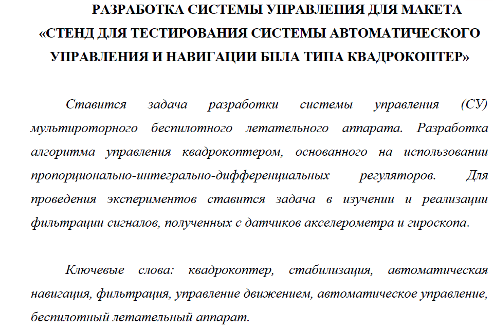 Для студентов МГТУ им. Н.Э.Баумана по предмету НИР - Теория автоматического управленияРазработка системы управления для макета "Стенд для тестирования системы автоматического управления и навигации БПЛА типа квадрокоптер"Разработка системы управления для макета "Стенд для тестирования системы автоматического управления и навигации БПЛА типа квадрокоптер"