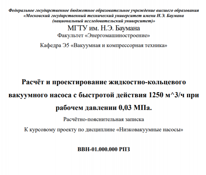 Для студентов МГТУ им. Н.Э.Баумана по предмету Низковакуумные насосыРасчёт и проектирование жидкостно-кольцевого вакуумного насоса с быстротой действия 1250 м^3/ч при рабочем давлении 0,03 МПа.Расчёт и проектирование жидкостно-кольцевого вакуумного насоса с быстротой действия 1250 м^3/ч при рабочем давлении 0,03 МПа.