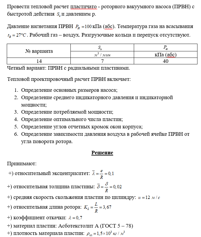 Для студентов МГТУ им. Н.Э.Баумана по предмету Низковакуумные насосыПРОВЕСТИ ТЕПЛОВОЙ РАСЧЕТ ПЛАСТИЧАТО - РОТОРНОГО ВАКУУМНОГО НАСОСА (ПРВН) С БЫСТРОТОЙ ДЕЙСТВИЯ S И ДАВЛЕНИЕМ PПРОВЕСТИ ТЕПЛОВОЙ РАСЧЕТ ПЛАСТИЧАТО - РОТОРНОГО ВАКУУМНОГО НАСОСА (ПРВН) С БЫСТРОТОЙ ДЕЙСТВИЯ S И ДАВЛЕНИЕМ P