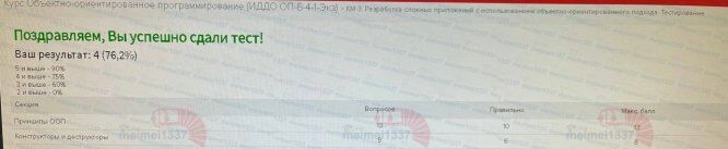 Курс Объектно-ориентированное программирование - КМ-3. Разработка сложных приложений с использованием объектно-ориентированного подхода. Тестирование - 76,2%
