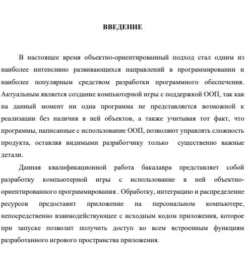 В настоящее время объектно-ориентированный подход стал одним из наиболее интенсивно развивающихся направлений в программировании и наиболее популярным средством разработки программного обеспечения. Актуальным является создание компьютерной игры с поддержкой ООП, так как на данный момент ни одна программа не представляется возможной к реализации без наличия в ней объектов, а также учитывая тот факт, что программы, написанные с использование ООП, позволяют управлять сложность продукта, оставляя видимыми разработчику только существенно важные детали. Данная квалификационной работа бакалавра представляет собой разработку компьютерной игры с использование в ней объектноориентированного программирования . Обработку, интеграцию и распределение ресурсов предоставит приложение на персональном компьютере, непосредственно взаимодействующее с исходным кодом приложения, которое при запуске позволит получить доступ ко всем встроенным функциям разработанного игрового пространства приложения