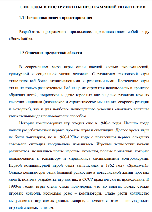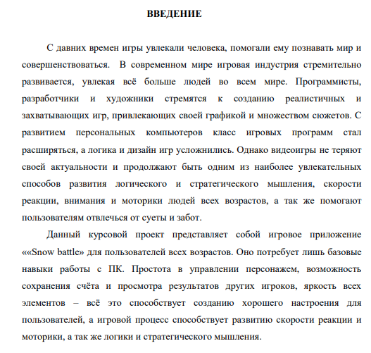 C давних времен игры увлекали человека, помогали ему познавать мир и совершенствоваться. В современном мире игровая индустрия стремительно развивается, увлекая всѐ больше людей во всем мире. Программисты, разработчики и художники стремятся к созданию реалистичных и захватывающих игр, привлекающих своей графикой и множеством сюжетов. С развитием персональных компьютеров класс игровых программ стал расширяться, а логика и дизайн игр усложнились. Однако видеоигры не теряют своей актуальности и продолжают быть одним из наиболее увлекательных способов развития логического и стратегического мышления, скорости реакции, внимания и моторики людей всех возрастов, а так же помогают пользователям отвлечься от суеты и забот. Данный курсовой проект представляет собой игровое приложение ««Snow battle » для пользователей всех возрастов. Оно потребует лишь базовые навыки работы с ПК. Простота в управлении персонажем, возможность сохранения счѐта и просмотра результатов других игроков, яркость всех элементов – всѐ это способствует созданию хорошего настроения для пользователей, а игровой процесс способствует развитию скорости реакции и моторики, а так же логики и стратегического мышления.