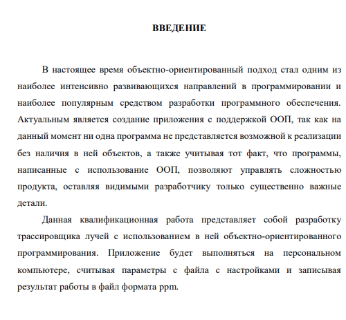 В настоящее время объектно-ориентированный подход стал одним из наиболее интенсивно развивающихся направлений в программировании и наиболее популярным средством разработки программного обеспечения. Актуальным является создание приложения с поддержкой ООП, так как на данный момент ни одна программа не представляется возможной к реализации без наличия в ней объектов, а также учитывая тот факт, что программы, написанные с использование ООП, позволяют управлять сложностью продукта, оставляя видимыми разработчику только существенно важные детали. Данная квалификационная работа представляет собой разработку трассировщика лучей с использованием в ней объектно-ориентированного программирования. Приложение будет выполняться на персональном компьютере, считывая параметры с файла с настройками и записывая результат работы в файл формата ppm.