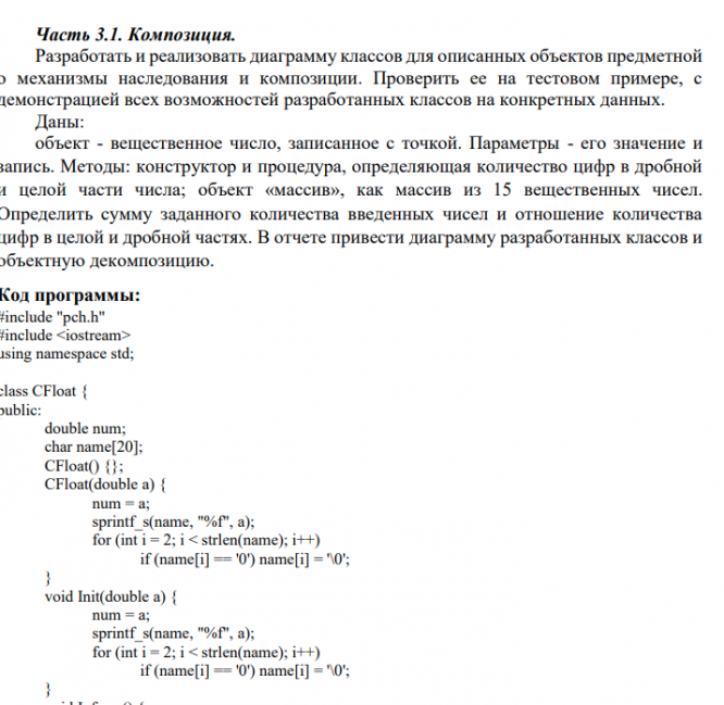 Разработать и реализовать диаграмму классов для описанных объектов предметной о механизмы наследования и композиции. Проверить ее на тестовом примере, с демонстрацией всех возможностей разработанных классов на конкретных данных. Даны: объект - вещественное число, записанное с точкой. Параметры - его значение и запись. Методы: конструктор и процедура, определяющая количество цифр в дробной и целой части числа; объект «массив», как массив из 15 вещественных чисел. Определить сумму заданного количества введенных чисел и отношение количества цифр в целой и дробной частях. В отчете привести диаграмму разработанных классов и объектную декомпозицию.