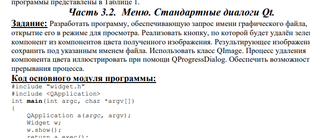 Задание: Разработать программу, обеспечивающую запрос имени графического файла, открытие его в режиме для просмотра. Реализовать кнопку, по которой будет удалён зеленый компонент из компонентов цвета полученного изображения. Результирующее изображение сохранить под указанным именем файла. Использовать класс QImage. Процесс удаления компонента цвета иллюстрировать при помощи QProgressDialog. Обеспечить возможность прерывания процесса.