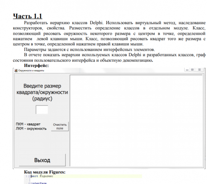 Часть 1.1 Разработать иерархию классов Delphi. Использовать виртуальный метод, наследование конструкторов, свойства. Разместить определение классов в отдельном модуле. Класс, позволяющий рисовать окружность некоторого размера с центром в точке, определенной нажатием левой клавиши мыши. Класс, позволяющий рисовать квадрат того же размера с центром в точке, определенной нажатием правой клавиши мыши. Параметры задаются с использованием интерфейсных элементов. В отчете показать иерархии используемых классов Delphi и разработанных классов, граф состояния пользовательского интерфейса и объектную декомпозицию.