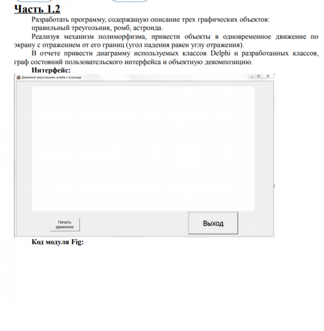 Часть 1.2 Разработать программу, содержащую описание трех графических объектов: правильный треугольник, ромб, астроида. Реализуя механизм полиморфизма, привести объекты в одновременное движение по экрану с отражением от его границ (угол падения равен углу отражения). В отчете привести диаграмму используемых классов Delphi и разработанных классов, граф состояний пользовательского интерфейса и объектную декомпозицию.