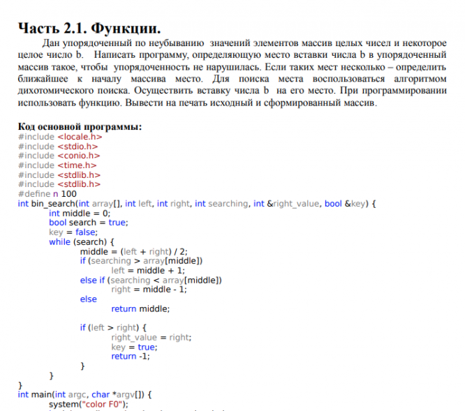 Часть 2.1. Функции. Дан упорядоченный по неубыванию значений элементов массив целых чисел и некоторое целое число b. Написать программу, определяющую место вставки числа b в упорядоченный массив такое, чтобы упорядоченность не нарушилась. Если таких мест несколько – определить ближайшее к началу массива место. Для поиска места воспользоваться алгоритмом дихотомического поиска. Осуществить вставку числа b на его место. При программировании использовать функцию. Вывести на печать исходный и сформированный массив