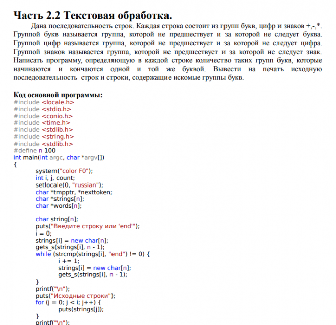 Часть 2.2 Текстовая обработка. Дана последовательность строк. Каждая строка состоит из групп букв, цифр и знаков +,-,*. Группой букв называется группа, которой не предшествует и за которой не следует буква. Группой цифр называется группа, которой не предшествует и за которой не следует цифра. Группой знаков называется группа, которой не предшествует и за которой не следует знак. Написать программу, определяющую в каждой строке количество таких групп букв, которые начинаются и кончаются одной и той же буквой. Вывести на печать исходную последовательность строк и строки, содержащие искомые группы букв.