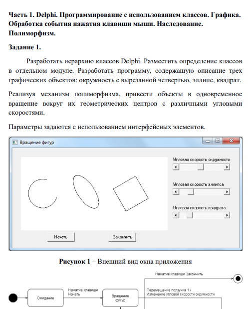 Задание 1. Разработать иерархию классов Delphi. Разместить определение классов в отдельном модуле. Разработать программу, содержащую описание трех графических объектов: окружность с вырезанной четвертью, эллипс, квадрат. Реализуя механизм полиморфизма, привести объекты в одновременное вращение вокруг их геометрических центров с различными угловыми скоростями. Параметры задаются с использованием интерфейсных элементов.