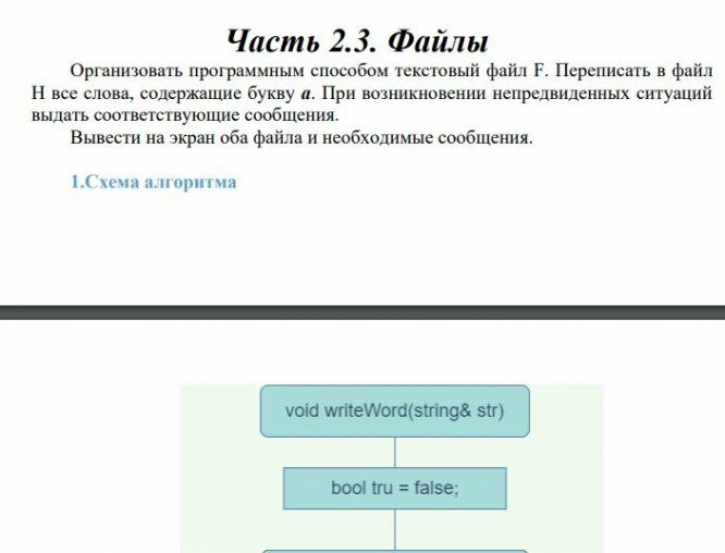 Часть 2.3. Файлы Организовать программным способом текстовый файл F. Переписать в файл H все слова, содержащие букву а. При возникновении непредвиденных ситуаций выдать соответствующие сообщения. Вывести на экран оба файла и необходимые сообщения.