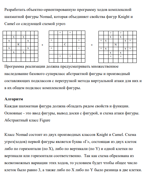 Разработать объектно-ориентированную программу ходов комплексной шахматной фигуры Nomad, которая объединяет свойства фигур Knight и Camel со следующей схемой угроз
