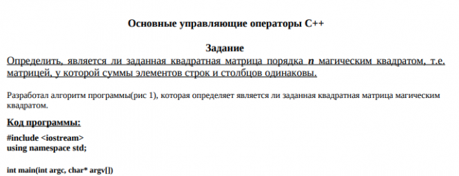 Определить, является ли заданная квадратная матрица порядка n магическим квадратом, т.е. матрицей, у которой суммы элементов строк и столбцов одинаковы. Разработал алгоритм программы(рис 1), которая определяет является ли заданная квадратная матрица магическим квадратом.