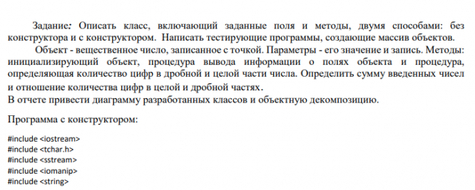 Описать класс, включающий заданные поля и методы, двумя способами: без конструктора и с конструктором. Написать тестирующие программы, создающие массив объектов. Объект - вещественное число, записанное с точкой. Параметры - его значение и запись. Методы: инициализирующий объект, процедура вывода информации о полях объекта и процедура, определяющая количество цифр в дробной и целой части числа. Определить сумму введенных чисел и отношение количества цифр в целой и дробной частях. В отчете привести диаграмму разработанных классов и объектную декомпозицию.
