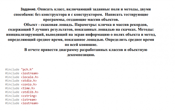 Задание. Описать класс, включающий заданные поля и методы, двумя способами: без конструктора и с конструктором. Написать тестирующие программы, создающие массив объектов. Объект - скаковая лошадь. Параметры: кличка и массив рекордов, содержащий 5 лучших результатов, показанных лошадью на скачках. Методы: инициализирующий, выводящий на экран информацию о полях объекта и метод, определяющий среднее время, показанное лошадью. Определить среднее время по всей конюшне. В отчете привести диаграмму разработан