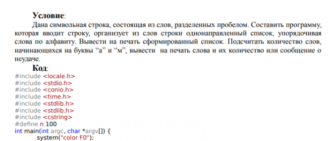 Условие: Дана символьная строка, состоящая из слов, разделенных пробелом. Составить программу, которая вводит строку, организует из слов строки однонаправленный список, упорядочивая слова по алфавиту. Вывести на печать сформированный список. Подсчитать количество слов, начинающихся на буквы “а” и “м”, вывести на печать слова и их количество или сообщение о неудаче.