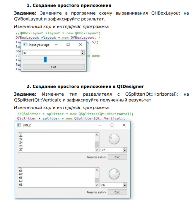 2. Создание простого приложения в QtDesigner Задание: Измените тип разделителя с QSplitter(Qt::Horizontal); на QSplitter(Qt::Vertical); и зафиксируйте полученный результат.![]()