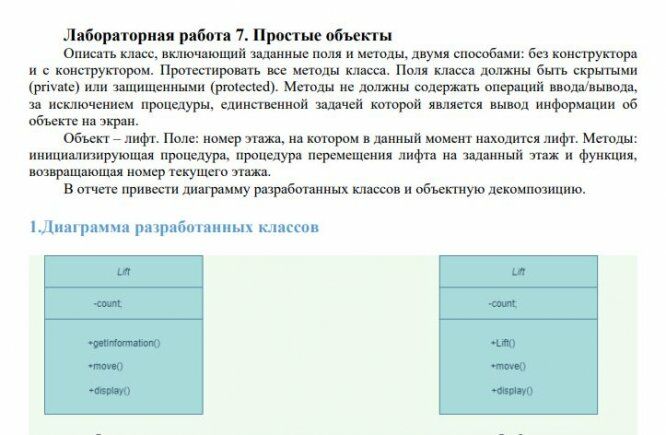 Описать класс, включающий заданные поля и методы, двумя способами: без конструктора и с конструктором. Протестировать все методы класса. Поля класса должны быть скрытыми (private) или защищенными (protected). Методы не должны содержать операций ввода/вывода, за исключением процедуры, единственной задачей которой является вывод информации об объекте на экран. Объект – лифт. Поле: номер этажа, на котором в данный момент находится лифт. Методы: инициализирующая процедура, процедура перемещения лифта на заданный этаж и функция, возвращающая номер текущего этажа. В отчете привести диаграмму разработанных классов и объектную декомпозицию.