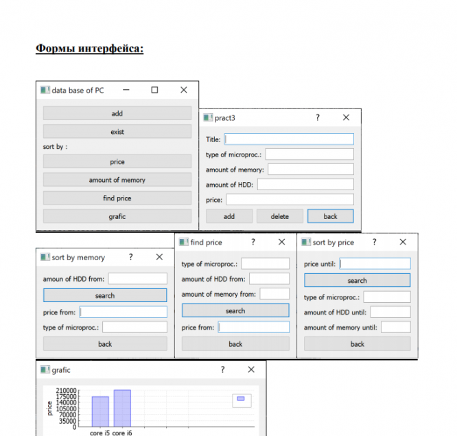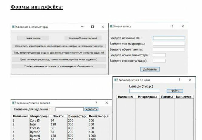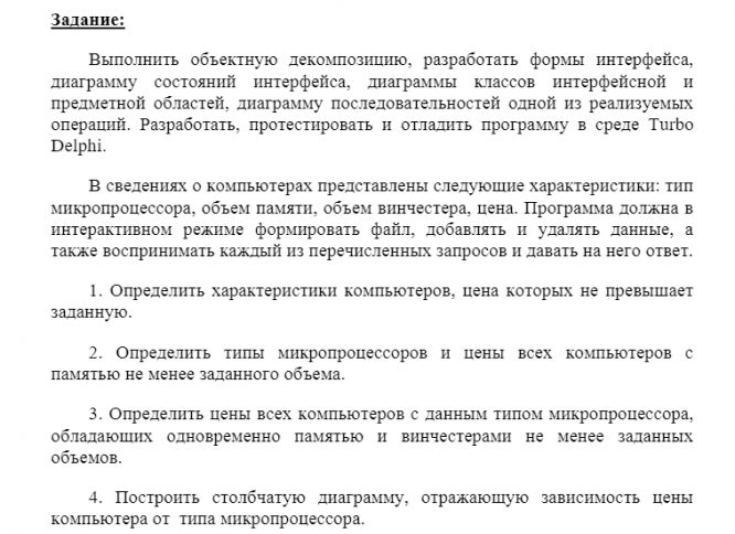 Выполнить объектную декомпозицию, разработать формы интерфейса, диаграмму состояний интерфейса, диаграммы классов интерфейсной и предметной областей, диаграмму последовательностей одной из реализуемых операций. Разработать, протестировать и отладить программу в среде Turbo Delphi. В сведениях о компьютерах представлены следующие характеристики: тип микропроцессора, объем памяти, объем винчестера, цена. Программа должна в интерактивном режиме формировать файл, добавлять и удалять данные, а также воспринимать каждый из перечисленных запросов и давать на него ответ. 1. Определить характеристики компьютеров, цена которых не превышает заданную. 2. Определить типы микропроцессоров и цены всех компьютеров с памятью не менее заданного объема. 3. Определить цены всех компьютеров с данным типом микропроцессора, обладающих одновременно памятью и винчестерами не менее заданных объемов. 4. Построить столбчатую диаграмму, отражающую зависимость цены компьютера от типа микропроцессора.
