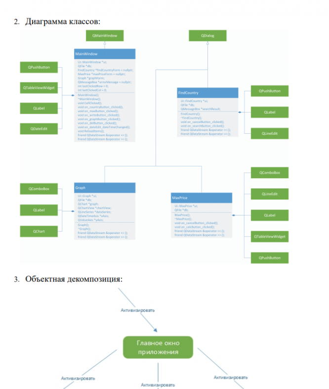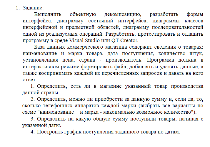 Выполнить объектную декомпозицию, разработать формы интерфейса, диаграмму состояний интерфейса, диаграммы классов интерфейсной и предметной областей, диаграмму последовательностей одной из реализуемых операций. Разработать, протестировать и отладить программу в среде Visual Studio или QT Creator. База данных коммерческого магазина содержит сведения о товарах: наименование и марка товара, дата поступления, количество штук, установленная цена, страна - производитель. Программа должна в интерактивном режиме формировать файл, добавлять и удалять данные, а также воспринимать каждый из перечисленных запросов и давать на него ответ. 1. Определить, есть ли в магазине указанный товар производства данной страны. 2. Определить, можно ли приобрести за данную сумму и, если да, то, сколько телефонных аппаратов каждой марки (выбрать все варианты по схеме "наименование и марка - максимально возможное количество"). 3. Определить на какую общую сумму поступили товары, начиная с указанной даты. 4. Построить график поступления заданного товара по датам.