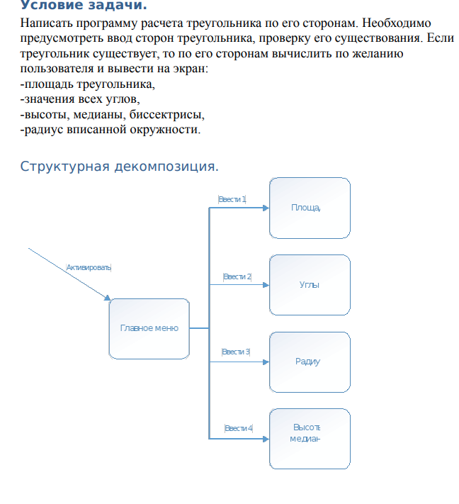 Условие задачи. Написать программу расчета треугольника по его сторонам. Необходимо предусмотреть ввод сторон треугольника, проверку его существования. Если треугольник существует, то по его сторонам вычислить по желанию пользователя и вывести на экран: -площадь треугольника, -значения всех углов, -высоты, медианы, биссектрисы, -радиус вписанной окружности.![]()