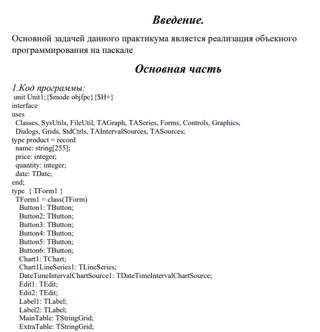 Выполнить объектную декомпозицию, разработать формы интерфейса, диаграмму состояний интерфейса, диаграммы классов интерфейсной и предметной областей, диаграмму последовательностей одной из реализуемых операций. Разработать, протестировать и отладить программу в среде Turbo Delphi. Сведения о товарах представлены наименованием каждого товара, ценой, объемом партии, датой поступления. Программа должна в интерактивном режиме формировать файл, добавлять и удалять данные, а также воспринимать каждый из перечисленных запросов и давать на него ответ. 1. Определять, какие товары поступили начиная с указанной даты. 2. Определять, какой товар имеет наибольшую стоимость партии. 3. Определять даты поступления и наименования товаров, объемы партий которых не меньше заданного значения. Получить общую стоимость партий этих товаров. 4. Построить график поступлений указанного товара.