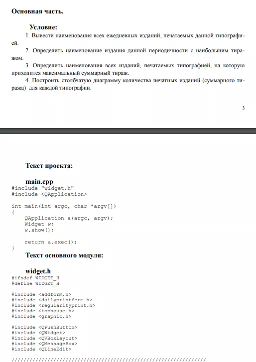 Выполнить объектную декомпозицию, разработать формы интерфейса, диаграмму состояний интерфейса, диаграммы классов интерфейсной и предметной областей, диаграмму последовательностей одной из реализуемых операций. Разработать, протестировать и отладить программу в среде Visual Studio или QT Creator. Некоторый файл содержит информацию о печатных изданиях. Для каждого из них определены: наименование, периодичность, тираж, год издания, типография. Программа должна в интерактивном режиме формировать файл, добавлять и удалять данные, а также воспринимать каждый из перечисленных запросов и давать на него ответ. 1. Вывести наименования всех ежедневных изданий, печатаемых данной типографией. 2. Определить наименование издания данной периодичности с наибольшим тиражом. 3. Определить наименования всех изданий, печатаемых типографией, на которую приходится максимальный суммарный тираж. 4. Построить столбчатую диаграмму количества печатных изданий (суммарного тиража) для каждой типографии.