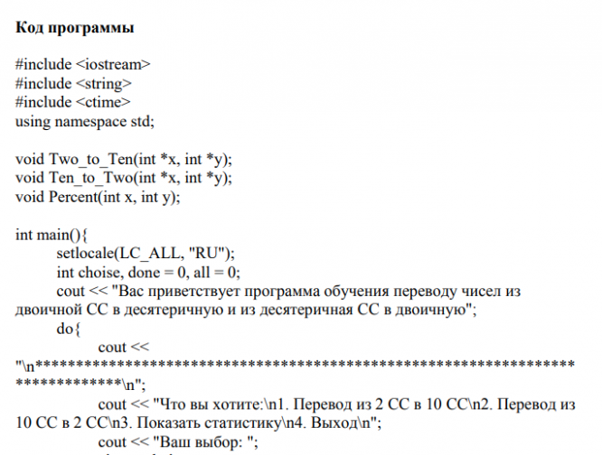 Выполнить структурную декомпозицию, разработать структурную схему, содержащую не менее 3 подпрограмм, и алгоритмы этих подпрограмм. Реализовать на С++ в консольном режиме. Предусмотреть примитивный интерфейс типа меню, позволяющий выбирать нужную подпрограмму. Написать программу для обучения переводу чисел длиной до 15 цифр в символьном виде из двоичной системы счисления в десятичную и из десятичной системы счисления в двоичную. Программа должна предлагать случайное двоичное число длиной 8 бит, а обучающийся - вводить его десятичный эквивалент или наоборот. Программа должна комментировать ответы и завершать работу по желанию обучаемого.